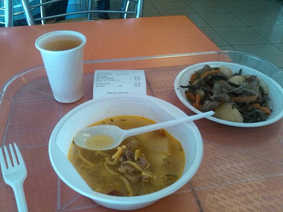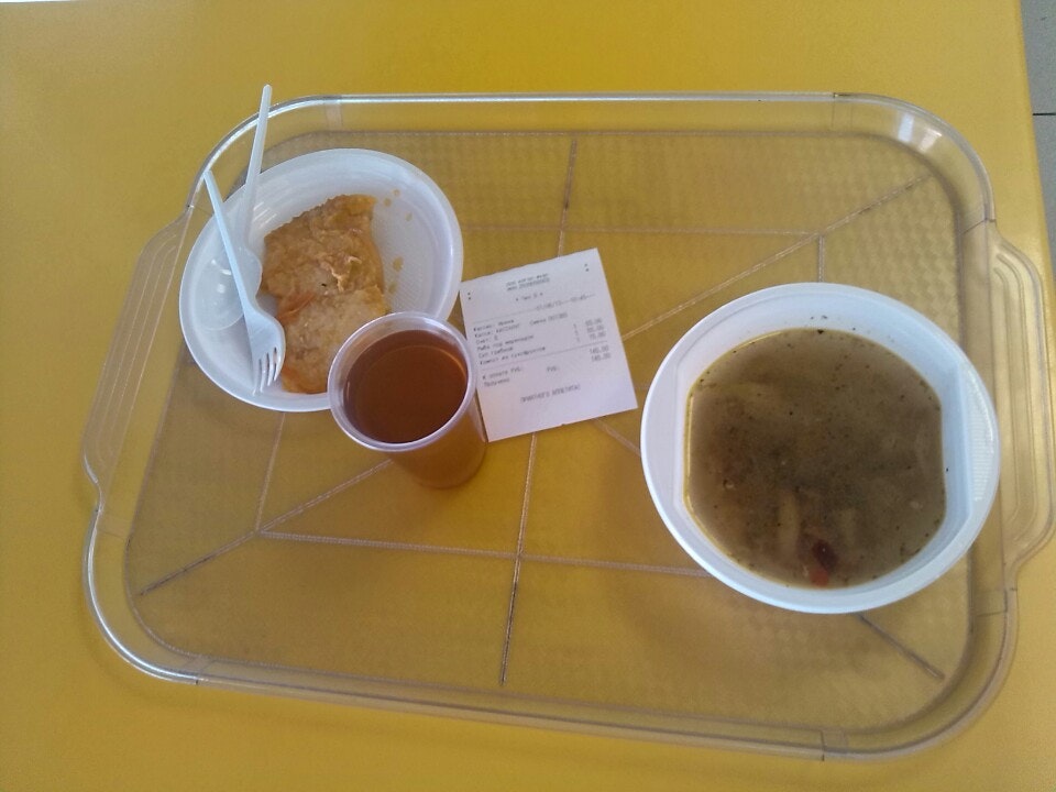 Суп грибной, маленький кусочек рыбы под маринадом и компот обойдется в 145 руб. Все в одноразовой посуде. На кухне рулят хачи.